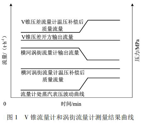 根據(jù)物料平衡反復(fù)研究,渦街流量計測量的質(zhì)量流量動態(tài)曲線比較客觀反映了蒸汽流量的變化; 而 V 錐流量計測量的質(zhì)量流量偏大 5%。說明該差壓流量計元件沒能產(chǎn)生和實際流量變化對應(yīng)的差壓。