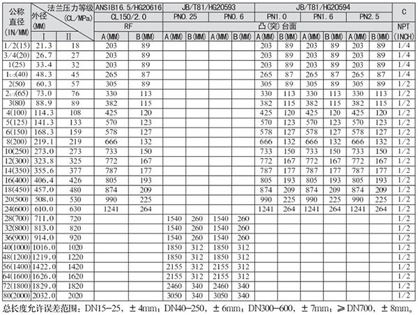 壓力等級(jí)(CL/MPa):150/2.0、300/5.0、600/11.0、900/15.0、1500/26.0、2500/42.0