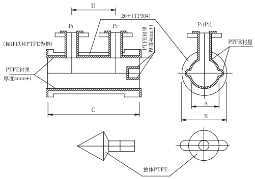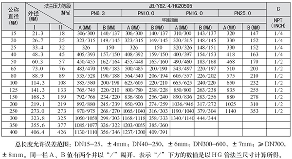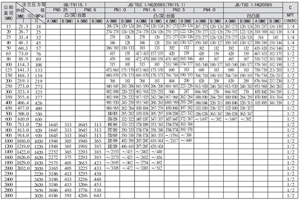 2.尺寸表中同一欄值有兩個(gè)并以/隔開,表示/下方的數(shù)值是以HG管法蘭尺寸計(jì)算所得。