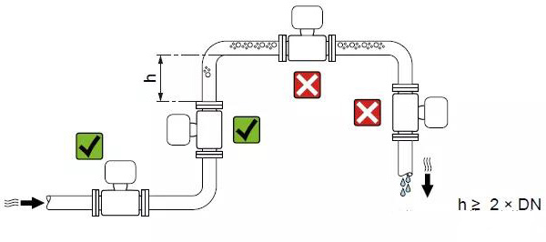 管路必須完全充滿液體。保證管路始終充滿液體至關(guān)重要,否則流量顯示會(huì)受到影響,而且還會(huì)出現(xiàn)測量錯(cuò)誤。管路結(jié)構(gòu)的設(shè)計(jì)必須要保證測流管始終充滿流體。當(dāng)流體有分流或含有固體顆粒沉淀物時(shí),建議使用垂直安裝。但采用垂直安裝時(shí),要遵循流體從下到上的走向,以保證管路充滿流體。