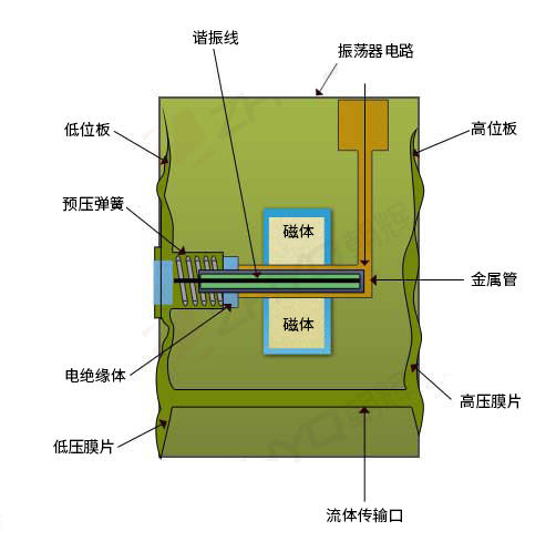 由磁場驅動的振蕩器電路會導致導線以其共振頻率振蕩。導線的一側牢固地固定到靜態(tài)部件,而另一側則連接到膜片。彈簧使電線預緊。由于過程壓力對隔膜的影響,金屬絲將在壓力升高時拉伸,而在壓力降低時收縮。共振頻率將相應地增加或減少。數(shù)字計數(shù)器測量諧振頻率的變化,并將其信號傳遞給微芯片,該微芯片還處理線性化補償和溫度補償。
