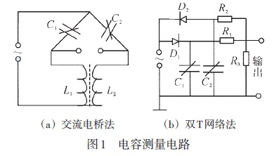 差壓液位變送器的測(cè)量電路如圖1所示,變送器的輸出可以轉(zhuǎn)換成電壓、電流或頻率等信號(hào),然后放大。圖1(a)的交流電橋法是將兩個(gè)電容器接于交流電橋的兩個(gè)相鄰臂上,交流電橋的輸出經(jīng)放大與相敏檢波后進(jìn)行測(cè)量。圖1(b)的雙T網(wǎng)絡(luò)法壓差引起的電容變化轉(zhuǎn)換成電壓變化輸出。在交流電源正半周時(shí),通過(guò)二極管D1對(duì)電流器C1進(jìn)行充電,在負(fù)半周時(shí),電容器C1經(jīng)電阻R1與R3進(jìn)行對(duì)地放電;而電容器C2 則在電源的負(fù)半周充電、正半周對(duì)R3 與R2 反向放電。因此R3上兩端的電壓輸出是由C1與C2的平均放電電流之差所決定的。當(dāng)壓差為零時(shí),C1、D1、R1與C2、D2、R2的參數(shù)相同,則通過(guò)R3的平均放電電流之差為零。當(dāng)壓差不等于零時(shí),差動(dòng)電容C1與C2一個(gè)增大一個(gè)減小,使兩者的平均放電電流不相等,因此R3兩端的電壓輸出也就有了相應(yīng)的變化。