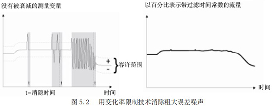 “變化率限制值”與“不敏感時間值”是用來消除某些增加阻尼不能除去的噪聲。它能夠從真實的流量信號中判別出階躍信號引起的噪聲和漿液尖狀噪聲。這種判別是以變化率的限制和持續(xù)時間為依據(jù)的。圖 5.2 所示為使用變化率限制技術(shù)去除粗大誤差的原理說明。該功能為在前面采樣中獲得的流量數(shù)據(jù)經(jīng)一階濾波后的,設(shè)定某一上限和下限(變化率)。如果當(dāng)前采樣的流量數(shù)據(jù)超過或低于這個極限值,而且在超過或低于這個極限值的變化時間之內(nèi),則認為這種變化是由于噪聲所引起的,CPU 予以切除;而當(dāng)超過或低于這個極限值的變化在設(shè)置的不敏感時間以外,則認為這種變化是由于真正的流量變化所引起,CPU 就認可是測量流量的變化。