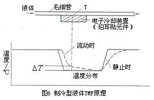 液體用tmf 在20世紀(jì)90年代初中期開(kāi)始發(fā)展并在工業(yè)生產(chǎn)中應(yīng)用,但當(dāng)前主要為微小流量?jī)x表。有消耗功率測(cè)量法的熱分布式tmf和利用珀?duì)柼? peltier)致冷元件在檢測(cè)部位致冷(即附加熱)的tmf。后者的測(cè)量原理如圖6所示,流量傳感器由測(cè)量毛細(xì)管、電子冷卻裝置(珀?duì)柼?和3各溫度檢出件組成。測(cè)量管和致冷元件接觸,無(wú)液體流動(dòng)時(shí)冷卻到某一溫度時(shí),兩者溫度相等;液體流動(dòng)時(shí)致冷元件附近測(cè)量毛細(xì)管溫度上升,如虛線所示分布,測(cè)量溫度檢測(cè)點(diǎn)的兩者溫度差以求的流量。