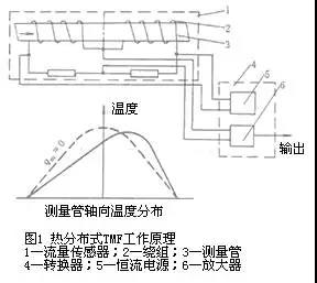 熱分布式tmf的工作原理如圖1所示,薄壁測量管3外壁繞著兩組兼作加熱器和檢測元件的繞組2,組成惠斯登電橋,由恒流電源5供給恒定熱量,通過線圈絕緣層、管壁、流體邊界層傳導熱量給管內(nèi)流體。邊界層內(nèi)熱的傳遞可以看作熱傳導方式實現(xiàn)的。在流量為零時,測量管上的溫度分布如圖下部虛線所示,相對于測量管中心的上下游是對稱的,由線圈和電阻組成的電橋處于平衡狀態(tài);當流體流動時,流體將上游的部分熱量帶給下游,導致溫度分布變化如實線所示,由電橋測出兩組線圈電阻值的變化,求得兩組線圈平均溫度差δt。便可按下式導出質(zhì)量流量qm,即