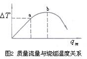 在總的熱傳導系數(shù)a中,因測量管壁很薄且具有相對較高熱導率,儀表制成后其值不變,因此a的變化可簡化認為主要是流體邊界層熱導率的變化。當使用于某一特定范圍的流體時,則a、cp均視為常量,則質(zhì)量流量僅與繞組平均溫度差成正比,如圖2 oa 段所示。 oa段為儀表正常測量范圍,儀表出口處流體不帶走熱量,或者說帶走熱量極微;超過a點流量增大到有部分熱量被帶走而呈現(xiàn)非線性,流量超過b點則大量熱量被帶走。