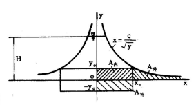 即縱坐標(biāo)y值趨近于零時(shí),橫坐標(biāo)x值趨近無(wú)窮大。這在堰板的實(shí)際制作上是無(wú)法實(shí)現(xiàn)的。若將堰口曲線(xiàn)的*低縱坐標(biāo)取為yo,在yo一下至(-yo)增開(kāi)一矩形,即高為2yo,寬為2x。的補(bǔ)償孔,從數(shù)學(xué)上可以證明,坐標(biāo)原點(diǎn)以下所增大的矩形面積(A補(bǔ))正好等于舍去的曲邊面積(A補(bǔ))。由圖3可知