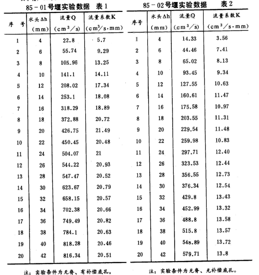 2.無(wú)補(bǔ)償?shù)卓椎碾p曲線(xiàn)無(wú)脊薄壁堰,見(jiàn)圖8,其流量與作用水頭之間變化關(guān)系基本上是線(xiàn)性的,流量系數(shù)K值隨作用水頭升高略有增大。