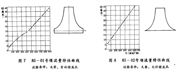 用85-01號(hào)和85-02號(hào)兩種雙曲線(xiàn)薄壁堰,在試驗(yàn)水槽端安裝成無(wú)脊有補(bǔ)償孔和無(wú)補(bǔ)償孔兩種情況,進(jìn)行了多次實(shí)驗(yàn),所得數(shù)據(jù)通過(guò)整理,畫(huà)出流量特性曲線(xiàn),見(jiàn)圖7和圖8。