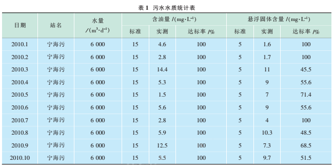 以一礦為例,2010年1~10月寧海污水站累計處理污水187萬m,日均6200m。,110月份外輸污水含油累計達(dá)標(biāo)率100%,外輸懸浮物累計達(dá)標(biāo)率69.7%(見表1)。