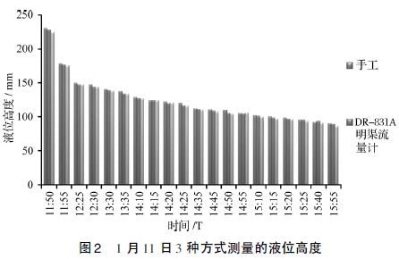由圖4可知,以手工實(shí)測(cè)液位高度為基準(zhǔn),2種流量計(jì)的誤差均在±5%的范圍內(nèi)。1月11日12:30~14:55期間,DR-831A和TKL-Ⅰ測(cè)量誤差比較接近。其他時(shí)段,2者呈現(xiàn)出前者測(cè)量誤差要小于后者測(cè)量誤差。