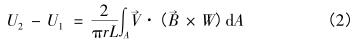 式中,U2-U1是兩電極的電勢差;A表示對所有空間積分;L為絕緣管道筒長一半;r為流量計截面管半徑;矢量珗B是導(dǎo)電流體的流速;B是磁感應(yīng)強度;W為矢量權(quán)重函數(shù),它是一個只由井水流量計本身結(jié)構(gòu)決定的量。由(2)式可知,只要確定了流體的流速V、磁感應(yīng)強度B、以及權(quán)重函數(shù)W,以及流量計管徑半徑,就可以求流量計的感應(yīng)電勢差。