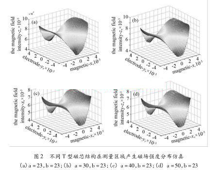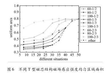 仿真實驗證明在有限的空間下,修改T磁芯的不同參數(shù),可以增加流量計測量區(qū)域內(nèi)部的磁場分布情況,也可以適當(dāng)?shù)恼{(diào)整流量計測量區(qū)域中的磁場強度與均勻度,根據(jù)生產(chǎn)測井中的實際工況,改變井水流量計的T磁芯參數(shù)獲得設(shè)計參數(shù)。