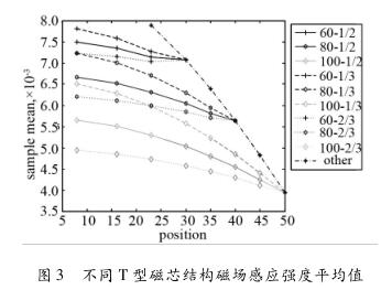 如圖3所示為不同T型磁芯結(jié)構(gòu)下測量區(qū)域產(chǎn)生磁場感應(yīng)強度平均值,圖中橫坐標為T型磁芯b的角度,縱坐標為測量區(qū)域的平均磁場強度,圖標表示的是T型磁芯的不同a的角度以及磁芯長端寬度所占的比例。其中以“角度-比例”表示,例如30-1/2表示T型磁芯的較長端角度a為30°,k1/(k1+k2)為1/2時的測量區(qū)域中平均磁場強度測量結(jié)果。圖標Other為T型磁芯較長端的角度a與較短端的角度b相等(即為23,30,35,40,45,50)時的流量計測量區(qū)域中的平均磁場強度。從仿真結(jié)果可以看出:T型磁芯的較長端的角度a越小,流量計測量區(qū)域中平均磁場強度越大;在T型磁芯的較長端的角度a一定時,T型磁芯的較短端的角度b越小,流量計測量區(qū)域中平均磁場強度越大;在T型磁芯的較長端的角度a與較短端的角度b一定時,T型磁芯的k1/(k1 + k2)越小,在流量計測量區(qū)域中平均磁場強度越大。