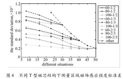 如圖4所示為不同T型磁芯結(jié)構(gòu)下測量區(qū)域產(chǎn)生磁場感應(yīng)強度標準差,圖中橫坐標為T型磁芯b的角度,縱坐標為測量區(qū)域磁場強度的標準差,圖標圖例與圖3中一致。從仿真結(jié)果可以看出:T型磁芯的較長端的角度a越小,流量計測量區(qū)域中磁場強度標準差越大;在T型磁芯的較長端的角度a一定時,T型磁芯的較短端的角度b越小,流量計測量區(qū)域中磁場強度標準差越大;在T型磁芯的較長端的角度a與較短端的角度b一定時,T型磁芯的k1/(k1 + k2)越小,在流量計測量區(qū)域中磁場強度標準差越大。