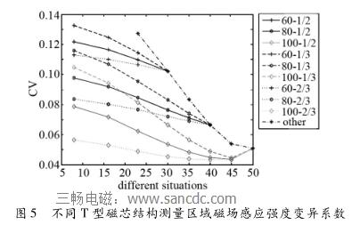 標準差代表磁場測量區(qū)域的磁場分布波動性較大,因而需引入變異系數(shù)對測量區(qū)域中的磁場分布情況進一步分析。如圖5所示為不同T型磁芯結(jié)構(gòu)下測量區(qū)域磁場感應(yīng)強度變異系數(shù),圖中橫坐標為T型磁芯b的角度,縱坐標為測量區(qū)域磁場強度分布的變異系數(shù),圖標圖例與圖3中一致。從仿真結(jié)果可以看出:T型磁芯的較長端的角度a越小,流量計測量區(qū)域中磁場強度變異系數(shù)越大;在T型磁芯的較長端的角度a一定時,T型磁芯的較短端的角度b越小,流量計測量區(qū)域中磁場強度變異系數(shù)越大;在T型磁芯的較長端的角度a與較短端的角度b一定時,T型磁芯的k1/(k1 + k2)越小,在流量計測量區(qū)域中磁場強度變異系數(shù)越大。異系數(shù)越大說明磁場分布越不均勻,波動性越大;異系數(shù)越小說明磁場分布趨向均勻。下面通過計算測量區(qū)域中的磁場均勻區(qū)域來對這一結(jié)果進一步的分析。