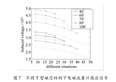 從仿真結(jié)果可以看出:T型磁芯的較長端的角度a越小,流量計電極兩端獲得的感應(yīng)信號越大;在T型磁芯的較長端的角度a一定時,T型磁芯的較短端的角度b越小,流量計電極兩端獲得的感應(yīng)信號越大。這主要是因為井水流量計勵磁線圈的增加,使得流量計測量區(qū)域的磁場強度增加,同樣分布的流速下使得流量計電極兩端的感應(yīng)信號增加。