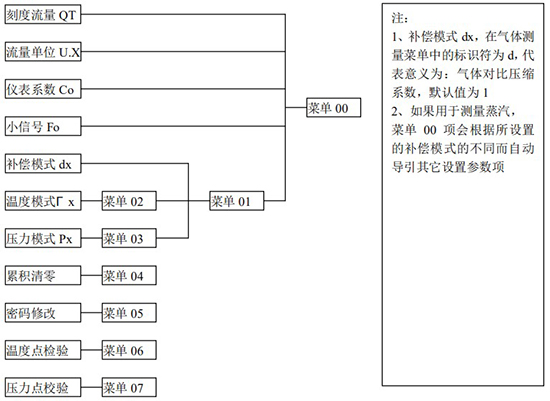 3.1、本儀表表頭采用自導(dǎo)引式和菜單式相結(jié)合的參數(shù)設(shè)置方式,所謂自導(dǎo)引式參數(shù)設(shè)置方式就是用戶(hù)在進(jìn)入菜單 00 項(xiàng)后,表頭中的微電腦會(huì)自動(dòng)導(dǎo)引用戶(hù)去設(shè)置需要設(shè)置的參數(shù)。另外,用戶(hù)也可以通過(guò)菜單模式分別對(duì)各組參數(shù)進(jìn)行設(shè)置。蒸汽測(cè)量菜單框圖如下: